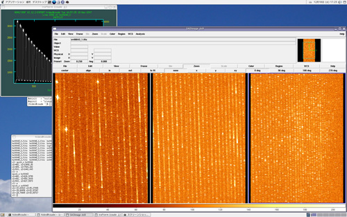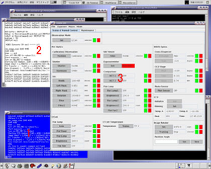 - 分光器のハードウェアの立ち上げおよび動作チェックは、観測期間の始めに観測所員が行います。ソフトウェアの立ち上げについては、観測者の方にお任せしておりますので、HIDESの準備など」を参考の上、作業を行なってください。なお、観測の準備が出来ている状態であれば、obs74-1の画面にはMessia5のステータス画面(図2中の1)、メシアサーバソフトウェアのステータス 画面(図4-1中の2)、HIDES制御用のGUIであるCoudeMain(図4-2) などが、obs74-3の画面にはクイック・ルック用のIRAF関係のソフトウェアが立ち上がっています。