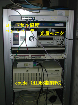- 観測時に使用するコンピュータ(クーデ焦点関係)は、coude (HIDESの制御、GUI、一時的なデータ置き場とquicklook)、do01 (三鷹へのデータ自動転送サーバー;2008.9.8現在観測者が直接データを転送することはしていません)、hides5(メシア制御PC)、 obs74-1, obs74-3(端末として利用)、miharin(スリットビュア;SV)があります。これらの計算機のうち、通常ユーザーがログインする必要のある マシンは観測室にあるobs74-1, obs74-3とcoude(ただしquicklook 領域のみ;obs74-3からアクセス)です。miharinの本体は組立調整室にあります。なお、気象モニタなどのために、観測室にあるobs74-2も使用することができます。