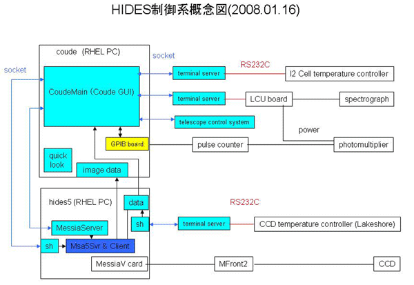 - 分光器の制御の大部分はLCUボード(清水ボード)経由で行なわれていますが、これらはハードウェア的には制御計算機(coude)と独立しており、制御計算機(coude)<==(Socket通信)==>ターミナル・サーバ <==(RS-232C通信)==>LCUボードと通信することでその制御を行なっています。