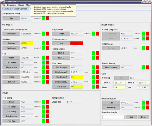 露出やそのためのHIDESの操作は基本的にCoude GUI(CoudeMain ソフトウェア)からできるようになっています。 GUIはメイン・フレームと、いくつかのサブ・フレーム (ダイアログ)から構成されていますが、通常、観測者に関係のある部分は、メイン・フレームのStatus & Maunal Controlタブ(図1)、Set & Go ダイアログ(図2)、LCU Control Macroダイアログ、photon monitorダイアログです。