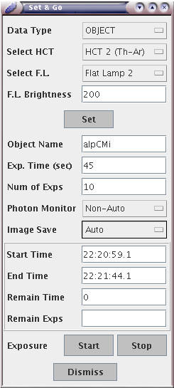 Set & Goダイアログは、「exposure」メニューから選択します。この画面では、Data-Typeなどを指定しSetボタンを押すと、HIDESの光学系の設定やランプのON/OFFが自動的に行なわれます。その後、天体名、露出時間などを指定し、exposure startボタンを押すと露出が開始され、データの取得を行なうことができます。設定の間違いなどを防ぐために、通常の観測ではこの機能を活用されることを推奨します。